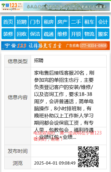家电售后接线客服20名,刚参加完的单招生也行,主要负责登记客户的安装/维修/以及咨询工作,要求18-38周岁,会讲普通话,简单电脑操作,8小时排班制,有晚班补助以上工作新人学习期间都会设保底工资,有专人带,包教包会,福利待遇:业绩红包+业绩奖品+绩效奖金 +过节福利+日常福利(水果,零食供应) 工作环境好,人事关系简单,欢迎踊跃报名,电话:18107425265 【电话咨询时,请一定说明在宁晋123看到的,谢谢!】 |