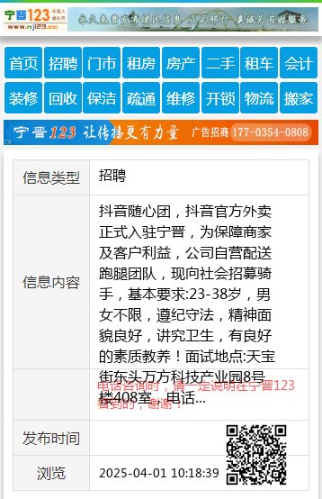 抖音随心团,抖音官方外卖正式入驻宁晋,为保障商家及客户利益,公司自营配送跑腿团队,现向社会招募骑手,基本要求:23-38岁,男女不限,遵纪守法,精神面貌良好,讲究卫生,有良好的素质教养!面试地点:天宝街东头万方科技产业园8号楼408室,电话☎:0319-5988880微信:19133132222 【电话咨询时,请一定说明在宁晋123看到的,谢谢!】 |