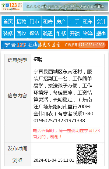 宁晋县西城区东南汪村,服装厂招副工一名,工作简单易学,接送孩子方便,工作环境好,冬暖夏凉,工资结算灵活,长期稳定,(东南汪广场东路向南直行200米全伟制衣)有意者联系13400196025/13231971338 【电话咨询时,请一定说明在宁晋123看到的,谢谢!】 |