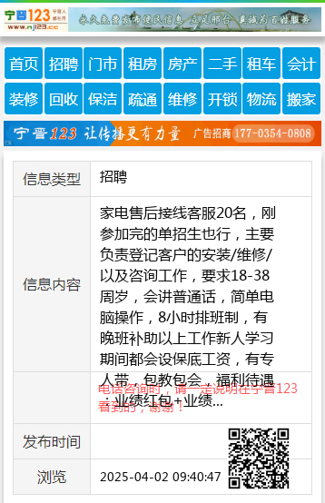 家电售后接线客服20名,刚参加完的单招生也行,主要负责登记客户的安装/维修/以及咨询工作,要求18-38周岁,会讲普通话,简单电脑操作,8小时排班制,有晚班补助以上工作新人学习期间都会设保底工资,有专人带,包教包会,福利待遇:业绩红包+业绩奖品+绩效奖金 +过节福利+日常福利(水果,零食供应) 工作环境好,人事关系简单,欢迎踊跃报名,电话:18107425265 【电话咨询时,请一定说明在宁晋123看到的,谢谢!】 |