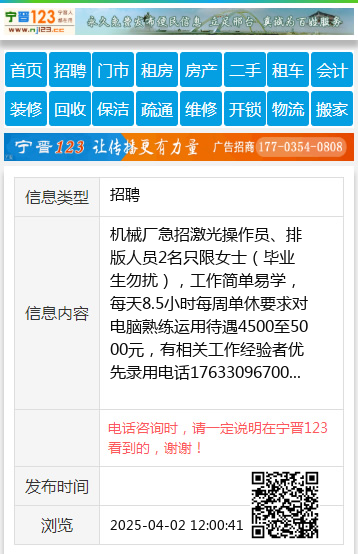 机械厂急招激光操作员、排版人员2名只限女士(毕业生勿扰),工作简单易学,每天8.5小时每周单休要求对电脑熟练运用待遇4500至5000元,有相关工作经验者优先录用电话17633096700 【电话咨询时,请一定说明在宁晋123看到的,谢谢!】 |