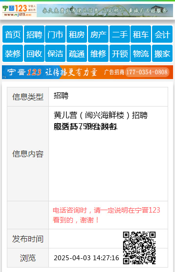 黄儿营(闽兴海鲜楼)招聘服务员,前台数名 电话15759913441