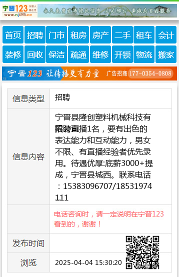 招聘直播1名,要有出色的表达能力和互动能力,男女不限、有直播经验者优先录用。待遇优厚:底薪3000+提成,宁晋县城西。联系电话:15383096707/18531974111