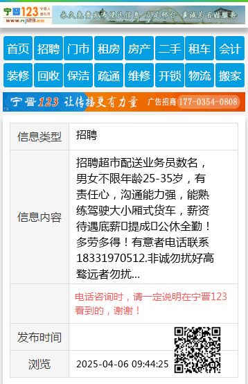 招聘超市配送业务员数名,男女不限年龄25-35岁,有责任心,沟通能力强,能熟练驾驶大小厢式货车,薪资待遇底薪➕提成➕公休全勤!多劳多得!有意者电话联系18331970512.非诚勿扰好高骛远者勿扰 【电话咨询时,请一定说明在宁晋123看到的,谢谢!】 |