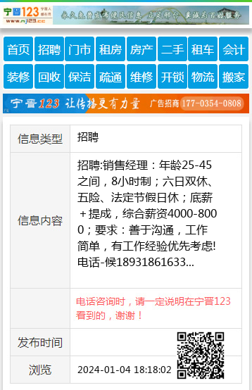 招聘:销售经理:年龄25-45之间,8小时制;六日双休、五险、法定节假日休;底薪+提成,综合薪资4000-8000;要求:善于沟通,工作简单,有工作经验优先考虑!电话-候18931861633 【电话咨询时,请一定说明在宁晋123看到的,谢谢!】 |