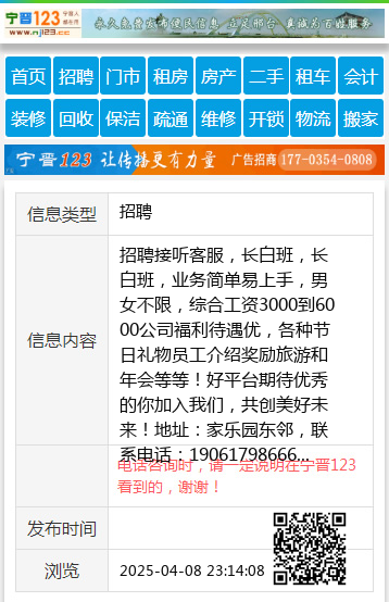 招聘接听客服,长白班,长白班,业务简单易上手,男女不限,综合工资3000到6000公司福利待遇优,各种节日礼物员工介绍奖励旅游和年会等等!好平台期待优秀的你加入我们,共创美好未来!地址:家乐园东邻,联系电话:19061798666 【电话咨询时,请一定说明在宁晋123看到的,谢谢!】 |