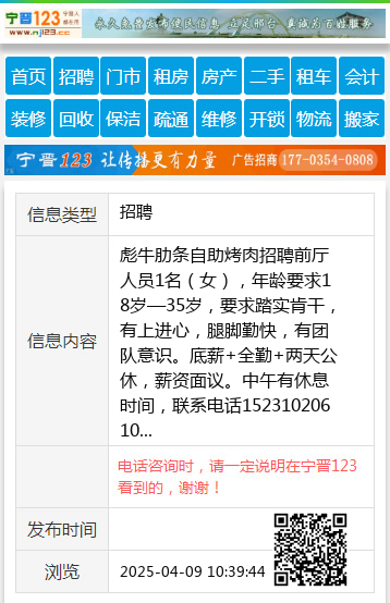 彪牛肋条自助烤肉招聘前厅人员1名(女),年龄要求18岁—35岁,要求踏实肯干,有上进心,腿脚勤快,有团队意识。底薪+全勤+两天公休,薪资面议。中午有休息时间,联系电话15231020610 【电话咨询时,请一定说明在宁晋123看到的,谢谢!】 |