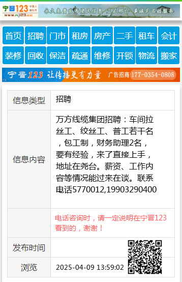 万方线缆集团招聘:车间拉丝工、绞丝工、普工若干名,包工制,财务助理2名,要有经验,来了直接上手,地址在尧台。薪资、工作内容等情况能过来在谈。联系电话5770012,19903290400