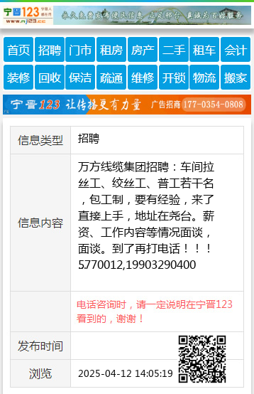 万方线缆集团招聘:车间拉丝工、绞丝工、普工若干名,包工制,要有经验,来了直接上手,地址在尧台。薪资、工作内容等情况面谈,面谈。到了再打电话!!!5770012,19903290400