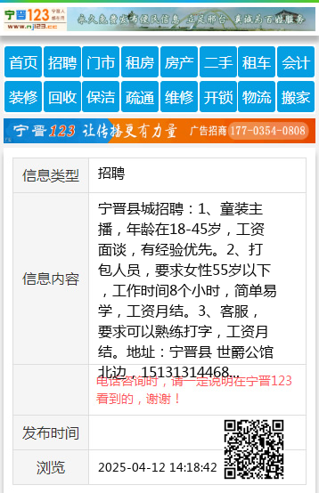 宁晋县城招聘:1、童装主播,年龄在18-45岁,工资面谈,有经验优先。2、打包人员,要求女性55岁以下,工作时间8个小时,简单易学,工资月结。3、客服,要求可以熟练打字,工资月结。地址:宁晋县 世爵公馆北边,15131314468 【电话咨询时,请一定说明在宁晋123看到的,谢谢!】 |