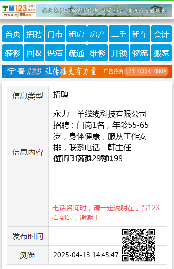 永力三羊线缆科技有限公司招聘:门岗1名,年龄55-65岁,身体健康,服从工作安排,联系电话:韩主任📞18732970199