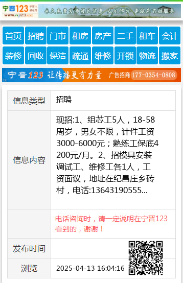 现招:1、组芯工5人,18-58周岁,男女不限,计件工资3000-6000元;熟练工保底4200元/月。2、招模具安装调试工、维修工各1人,工资面议,地址在纪昌庄乡砖村,电话:13643190555 【电话咨询时,请一定说明在宁晋123看到的,谢谢!】 |