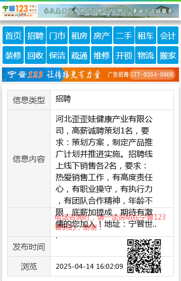 河北歪歪娃健康产业有限公司,高薪诚聘策划1名,要求:策划方案,制定产品推广计划并推进实施。招聘线上线下销售各2名,要求:热爱销售工作,有高度责任心,有职业操守,有执行力,有团队合作精神,年龄不限,底薪加提成,期待有激情的您加入!地址:宁晋世爵公馆,联系电话:17532378688,0319-5689888