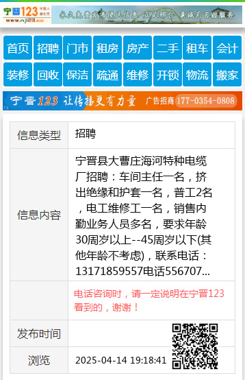 宁晋县大曹庄海河特种电缆厂招聘:车间主任一名,挤出绝缘和护套一名,普工2名,电工维修工一名,销售内勤业务人员多名,要求年龄30周岁以上--45周岁以下(其他年龄不考虑),联系电话:13171859557电话556707 【电话咨询时,请一定说明在宁晋123看到的,谢谢!】 |