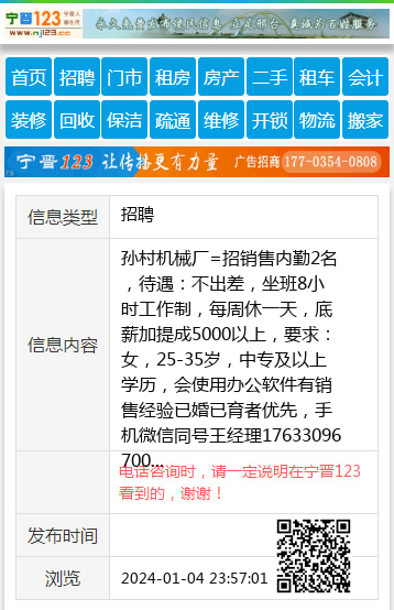 孙村机械厂=招销售内勤2名,待遇:不出差,坐班8小时工作制,每周休一天,底薪加提成5000以上,要求:女,25-35岁,中专及以上学历,会使用办公软件有销售经验已婚已育者优先,手机微信同号王经理17633096700 【电话咨询时,请一定说明在宁晋123看到的,谢谢!】 |