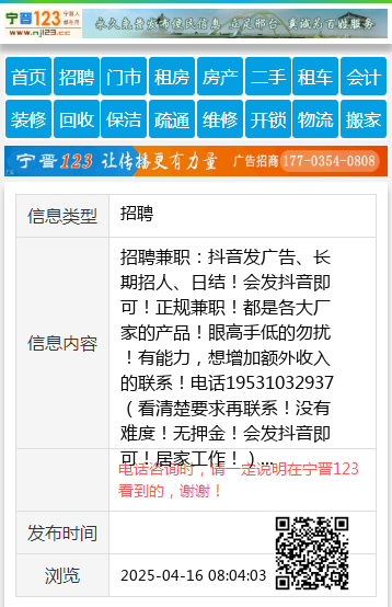 招聘兼职:抖音发广告、长期招人、日结!会发抖音即可!正规兼职!都是各大厂家的产品!眼高手低的勿扰!有能力,想增加额外收入的联系!电话19531032937(看清楚要求再联系!没有难度!无押金!会发抖音即可!居家工作!) 【电话咨询时,请一定说明在宁晋123看到的,谢谢!】 |