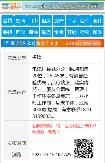 电缆厂县城分公司诚聘销售20位,25-45岁,有销售经验优先,品行端正,踏实肯努力,服从公司统一管理!工作环境冬暖夏凉,,八小时工作制,周末单休,底薪3000加提成,有意联系18103199033 【电话咨询时,请一定说明在宁晋123看到的,谢谢!】 |