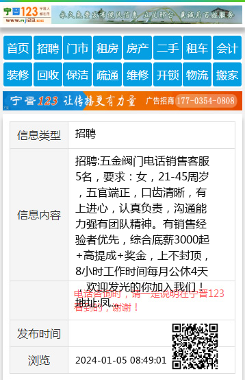 招聘:五金阀门电话销售客服5名,要求:女,21-45周岁,五官端正,口齿清晰,有上进心,认真负责,沟通能力强有团队精神。有销售经验者优先,综合底薪3000起+高提成+奖金,上不封顶,8小时工作时间每月公休4天,欢迎发光的你加入我们!地址:凤凰名品电话:19912076665 【电话咨询时,请一定说明在宁晋123看到的,谢谢!】 |