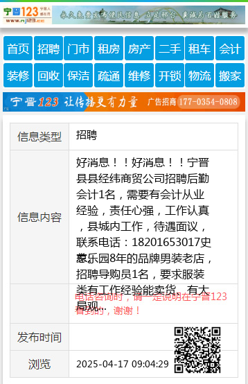 好消息!!好消息!!宁晋县县经纬商贸公司招聘后勤会计1名,需要有会计从业经验,责任心强,工作认真,县城内工作,待遇面议,联系电话:18201653017史总。