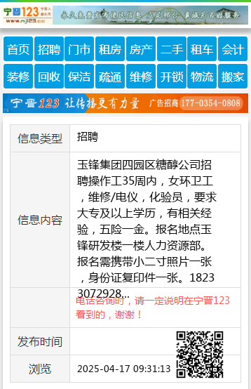 玉锋集团四园区糖醇公司招聘操作工35周内,女环卫工,维修/电仪,化验员,要求大专及以上学历,有相关经验,五险一金。报名地点玉锋研发楼一楼人力资源部。报名需携带小二寸照片一张,身份证复印件一张。18233072928