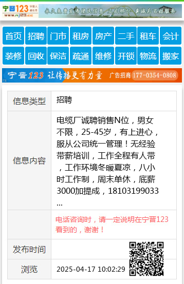 电缆厂诚聘销售N位,男女不限,25-45岁,有上进心,服从公司统一管理!无经验带薪培训,工作全程有人带,工作环境冬暖夏凉,八小时工作制,周末单休,底薪3000加提成,18103199033 【电话咨询时,请一定说明在宁晋123看到的,谢谢!】 |