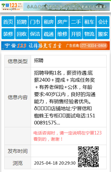 招聘导购1名,薪资待遇:底薪2400+提成+完成任务奖+有养老保险+公休,年龄要求:40岁以内,良好的沟通能力,有销售经验者优先。🏘️店铺地址:宁晋信和蜘蛛王专柜☎️面试电话:15100891575 【电话咨询时,请一定说明在宁晋123看到的,谢谢!】 |