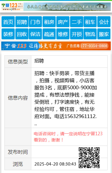 招聘:快手男装,带货主播,拍摄,视频剪辑,小店客服各3名,底薪5000-9000加提成,有想法想挣钱,能接受倒班,打字速度快,有无经验均可,管住宿,地址华府对面。电话15632961112 【电话咨询时,请一定说明在宁晋123看到的,谢谢!】 |