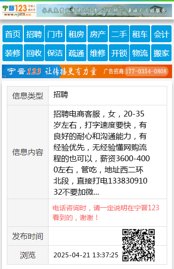 招聘电商客服,女,20-35岁左右,打字速度要快,有良好的耐心和沟通能力,有经验优先,无经验懂网购流程的也可以,薪资3600-4000左右,管吃,地址西二环北段,直接打电13383091032不要加微 【电话咨询时,请一定说明在宁晋123看到的,谢谢!】 |