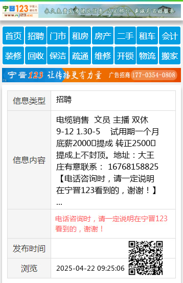 电缆销售 文员 主播 双休 9-12 1.30-5 试用期一个月底薪2000➕提成 转正2500➕提成上不封顶。地址:大王庄有意联系: 16768158825【电话咨询时,请一定说明在宁晋123看到的,谢谢!】 【电话咨询时,请一定说明在宁晋123看到的,谢谢!】 |