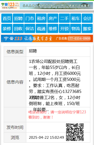 1农场公司配胶处招聘男工一名,年龄55岁以内,长白班,12小时,月工资6000元。试用期一个月工资5000元。要求:工作认真,吃苦耐劳,踏实有责任心13273685370。
