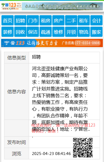 河北歪歪娃健康产业有限公司,高薪诚聘策划一名,要求:策划方案,制定产品推广计划并推进实施。招聘线上线下销售各二名,要求:热爱销售工作,有高度责任心,有职业操守,有执行力,有团队合作精神,年龄不限,底薪加提成,期待有激情的您加入!地址:宁晋世爵公馆,联系电话:17532378688,0319-5689888 【电话咨询时,请一定说明在宁晋123看到的,谢谢!】 |