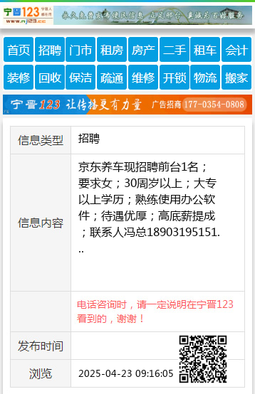 京东养车现招聘前台1名;要求女;30周岁以上;大专以上学历;熟练使用办公软件;待遇优厚;高底薪提成;联系人冯总18903195151 【电话咨询时,请一定说明在宁晋123看到的,谢谢!】 |