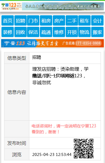 理发店招聘:烫染助理,学员, 地址:天一广场附近 电话/微:15030488123,非诚勿扰