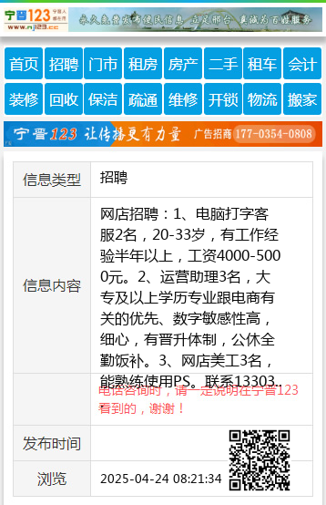 网店招聘:1、电脑打字客服2名,20-33岁,有工作经验半年以上,工资4000-5000元。2、运营助理3名,大专及以上学历专业跟电商有关的优先、数字敏感性高,细心,有晋升体制,公休全勤饭补。3、网店美工3名,能熟练使用PS。联系13303194319 电视台西行 【电话咨询时,请一定说明在宁晋123看到的,谢谢!】 |