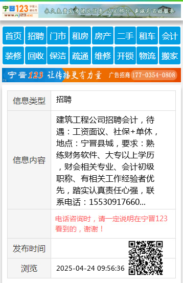 建筑工程公司招聘会计,待遇:工资面议、社保+单休,地点:宁晋县城,要求:熟练财务软件、大专以上学历,财会相关专业、会计初级职称、有相关工作经验者优先,踏实认真责任心强,联系电话:15530917660 【电话咨询时,请一定说明在宁晋123看到的,谢谢!】 |