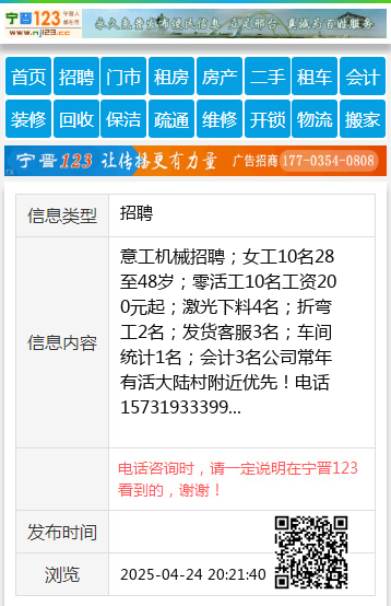意工机械招聘;女工10名28至48岁;零活工10名工资200元起;激光下料4名;折弯工2名;发货客服3名;车间统计1名;会计3名公司常年有活大陆村附近优先!电话15731933399 【电话咨询时,请一定说明在宁晋123看到的,谢谢!】 |