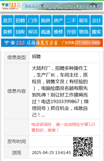 大陆村厂,招聘多种操作工,生产厂长,车间主任,质检员,销售文员(有经验的),电脑绘图员名额有限先到先得!别让好工作擦肩而过!电话19103399867(微信同号)抓住机会,成就自己! 【电话咨询时,请一定说明在宁晋123看到的,谢谢!】 |