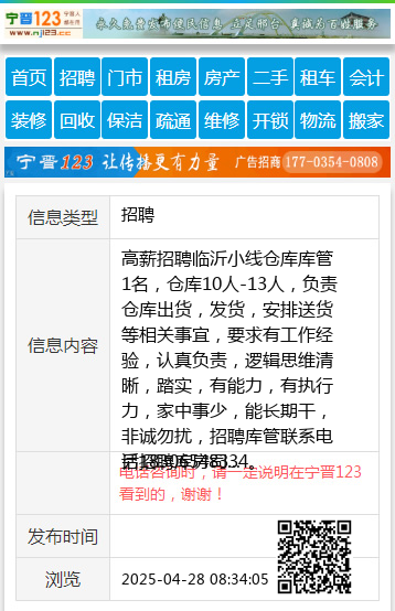 高薪招聘临沂小线仓库库管1名,仓库10人-13人,负责仓库出货,发货,安排送货等相关事宜,要求有工作经验,认真负责,逻辑思维清晰,踏实,有能力,有执行力,家中事少,能长期干,非诚勿扰,招聘库管联系电话18306548334。