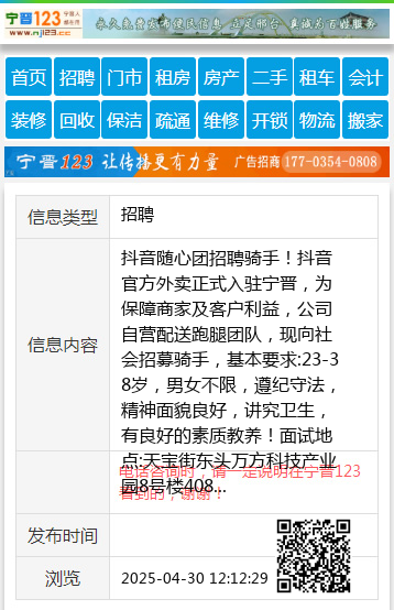 抖音随心团招聘骑手!抖音官方外卖正式入驻宁晋,为保障商家及客户利益,公司自营配送跑腿团队,现向社会招募骑手,基本要求:23-38岁,男女不限,遵纪守法,精神面貌良好,讲究卫生,有良好的素质教养!面试地点:天宝街东头万方科技产业园8号楼408室,电话:0319-5988880 微信:19133132222 【电话咨询时,请一定说明在宁晋123看到的,谢谢!】 |