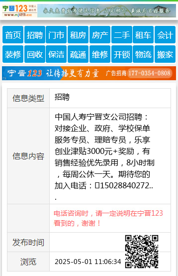 中国人寿宁晋支公司招聘:对接企业、政府、学校保单服务专员、理赔专员,乐享创业津贴3000元+奖励,有销售经验优先录用,8小时制,每周公休一天。期待您的加入电话:15028840272 【电话咨询时,请一定说明在宁晋123看到的,谢谢!】 |
