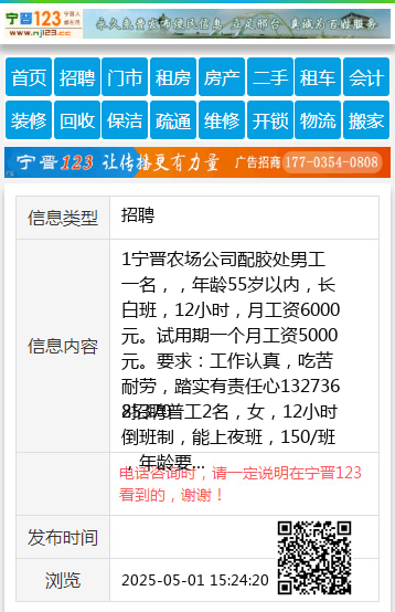 1宁晋农场公司配胶处男工一名,,年龄55岁以内,长白班,12小时,月工资6000元。试用期一个月工资5000元。要求:工作认真,吃苦耐劳,踏实有责任心13273685370