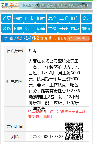 大曹庄农场公司配胶处男工一名,,年龄55岁以内,长白班,12小时,月工资6000元。试用期一个月工资5000元。要求:工作认真,吃苦耐劳,踏实有责任心13273685370