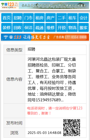 河渠河北晶达包装厂现大量招聘质检员、印刷工、分切工、复合工、合掌工、制袋工、维修工、业务员等各岗工人,有无经验均可,待遇优厚,每月按时发放工资,地址:油房硕达塑业,微信同号15194937689 【电话咨询时,请一定说明在宁晋123看到的,谢谢!】 |