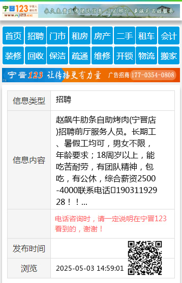 赵飙牛肋条自助烤肉(宁晋店)招聘前厅服务人员。长期工、暑假工均可,男女不限,年龄要求;18周岁以上,能吃苦耐劳,有团队精神,包吃,有公休,综合薪资2500-4000联系电话19031192928!!