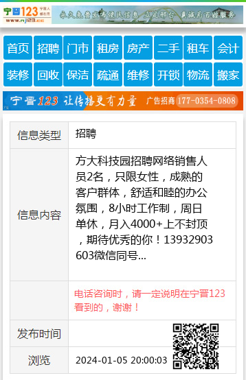 方大科技园招聘网络销售人员2名,只限女性,成熟的客户群体,舒适和睦的办公氛围,8小时工作制,周日单休,月入4000+上不封顶,期待优秀的你!13932903603微信同号 【电话咨询时,请一定说明在宁晋123看到的,谢谢!】 |