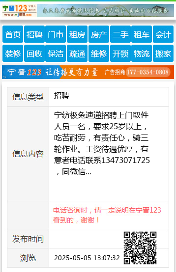 宁纺极兔速递招聘上门取件人员一名,要求25岁以上,吃苦耐劳,有责任心,骑三轮作业。工资待遇优厚,有意者电话联系13473071725,同微信 【电话咨询时,请一定说明在宁晋123看到的,谢谢!】 |