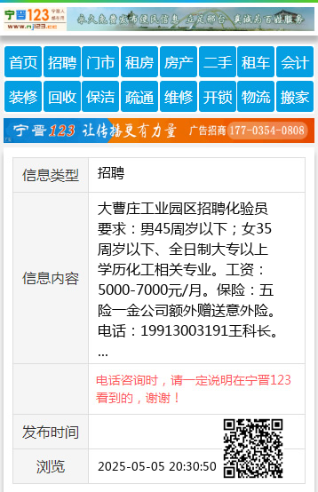 女35周岁以下、全日制大专以上学历化工相关专业。工资:5000-7000元/月。保险:五险一金公司额外赠送意外险。电话:19913003191王科长。 【电话咨询时,请一定说明在宁晋123看到的,谢谢!】 |