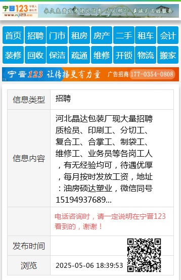 河北晶达包装厂现大量招聘质检员、印刷工、分切工、复合工、合掌工、制袋工、维修工、业务员等各岗工人,有无经验均可,待遇优厚,每月按时发放工资,地址:油房硕达塑业,微信同号15194937689
