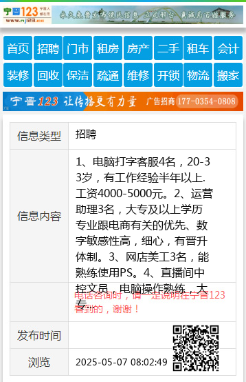 1、电脑打字客服4名,20-33岁,有工作经验半年以上.工资4000-5000元。2、运营助理3名,大专及以上学历专业跟电商有关的优先、数字敏感性高,细心,有晋升体制。3、网店美工3名,能熟练使用PS。4、直播间中控文员,电脑操作熟练,大专毕业。以上岗位都有全勤公休饭补。联系 13303194319 宁高路电视台西行