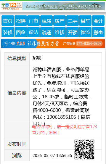 诚聘电话客服,业务简单易上手?有热线在线客服经验优先,免费培训,可以接送孩子,男女均可,可居家办公,18-45岁,临时工勿扰,月休4天/8天可选,综合薪资4000-6000,抓紧时间联系我:19061895105(微信同号)